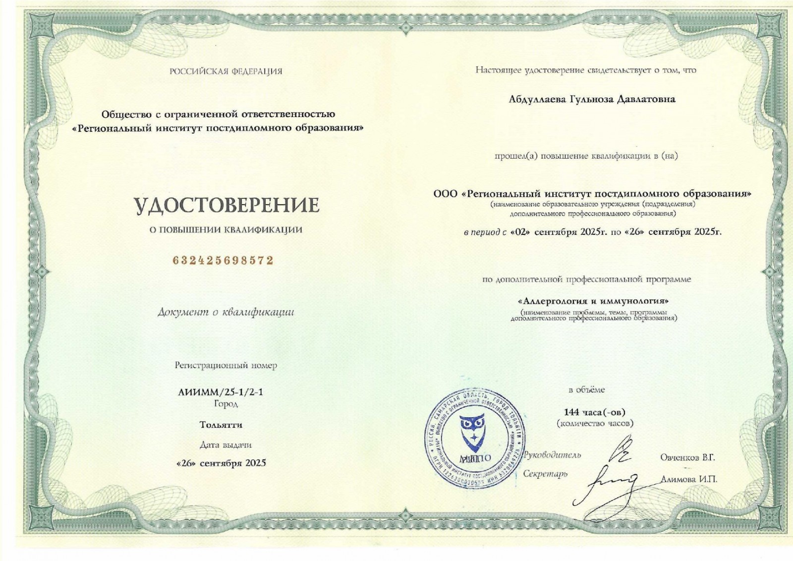 Член российской и европейской ассоциации аллергологов и клинических иммунологов