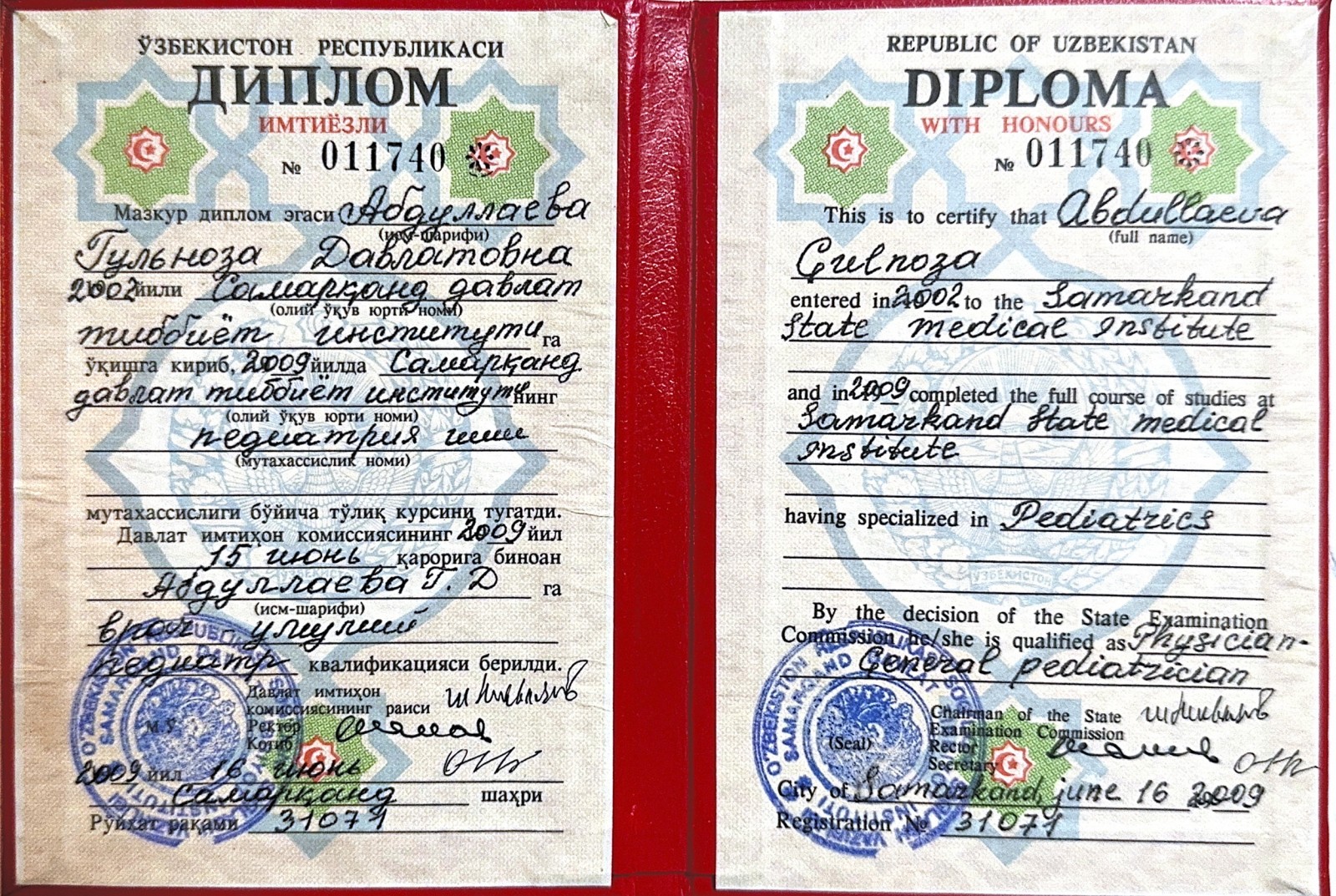 - 2002 - 2009 гг. Самаркандский Государственный Медицинский Институт им И.П. Павлова, педиатрический факультет