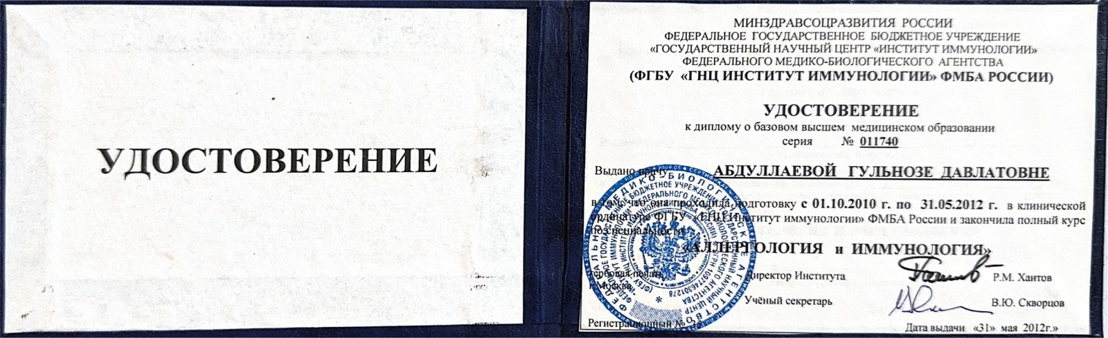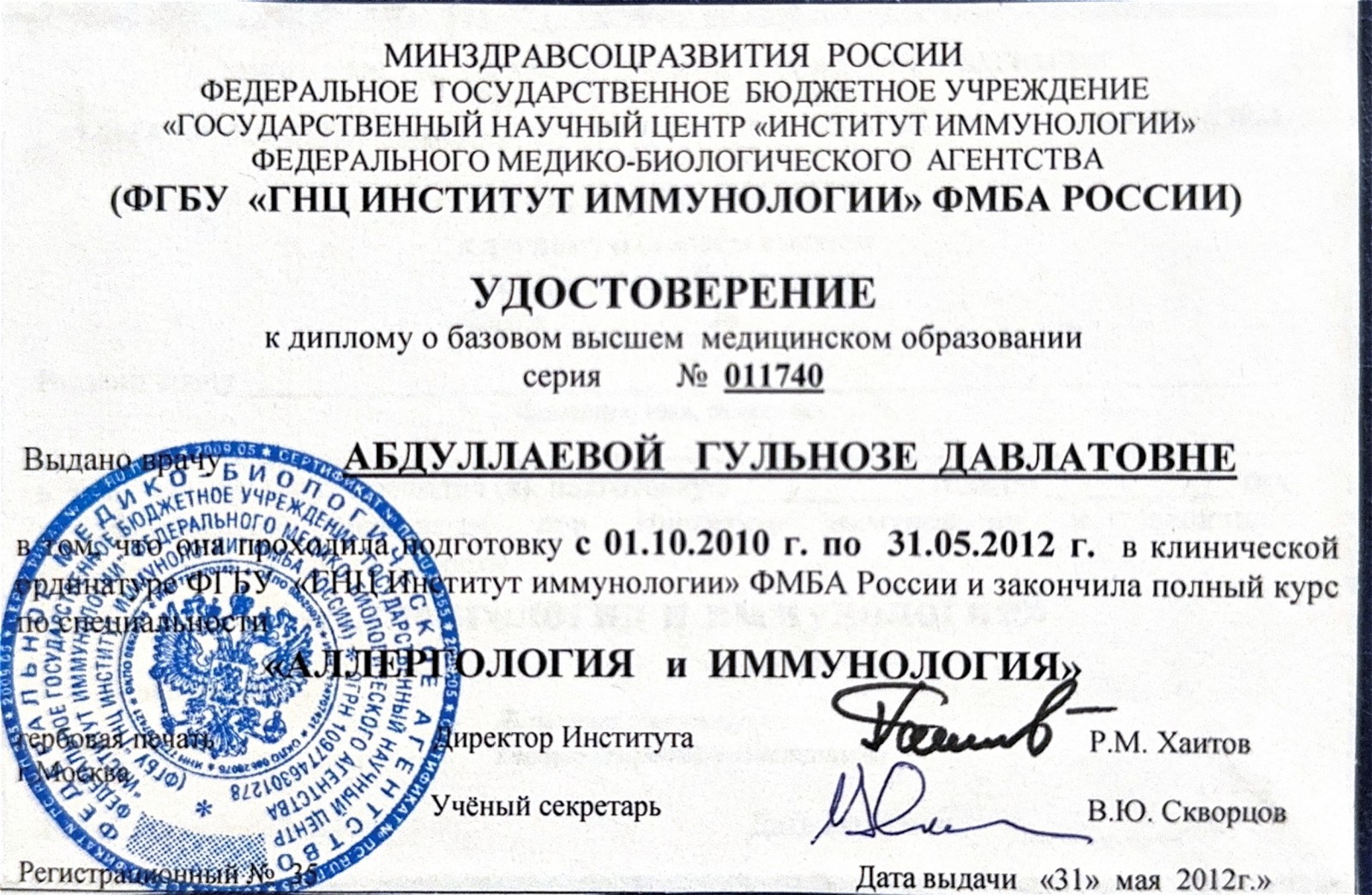 - 2010 - 2012 гг. клиническая ординатура ФГБУ ГНЦ Институт иммунологии ФМБА России по специальности аллергология - клиническая иммунология