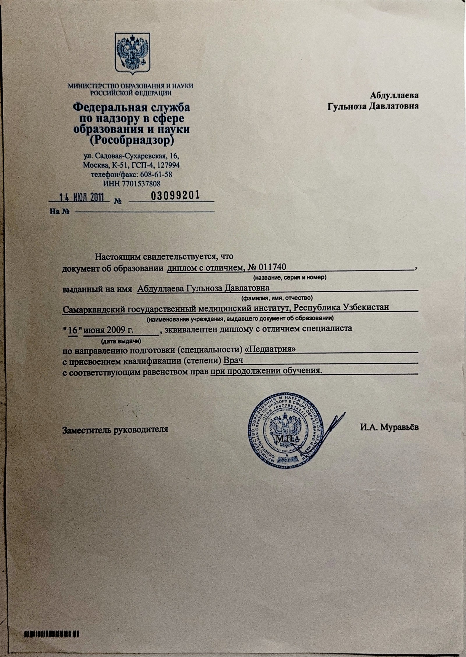 Мы хотим выразить нашу благодарность доктору Абдуллаевой Гульнозе Давлатовне за отличный прием. Она очень подробно всё объяснила, без ненужных задержек и дополнительных расходов. Мы остались весьма довольны услугами врача и с уверенностью можем рекомендовать её другим.