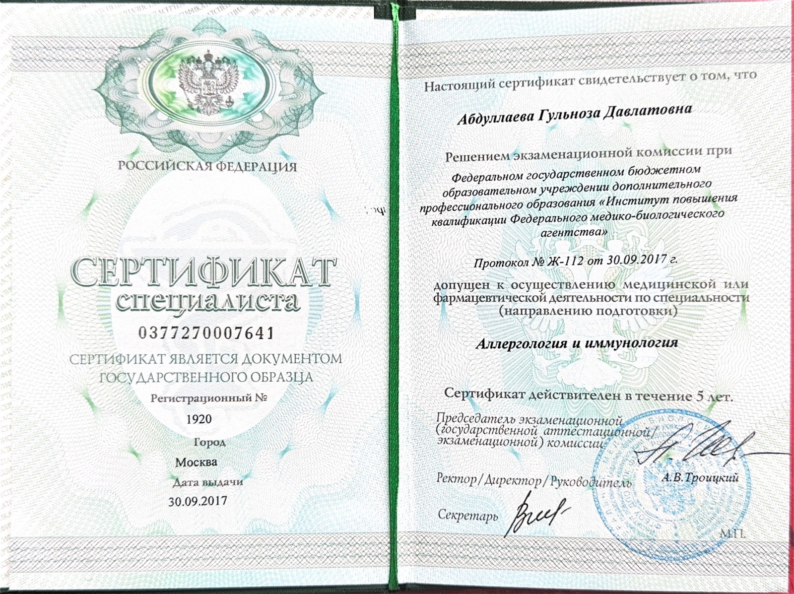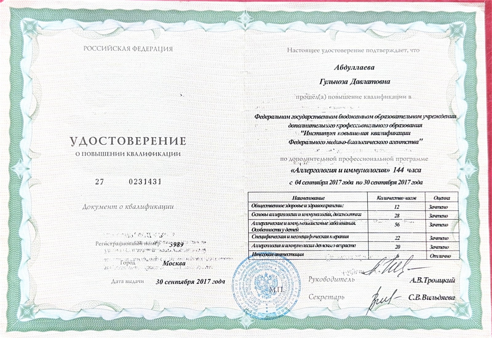 - Сертификат о прохождении курса Аллергенспецифической иммунотерапии (АСИТ) и сублингвальной иммунотерапии (СлИТ) препаратом “Фосталь”, «Сталораль» аллергены пыльцы деревьев, «Оралейр» аллергены пыльцы луговых трав Москва 2014, ФГБУ ГНЦ Институт иммунологии ФМБА России