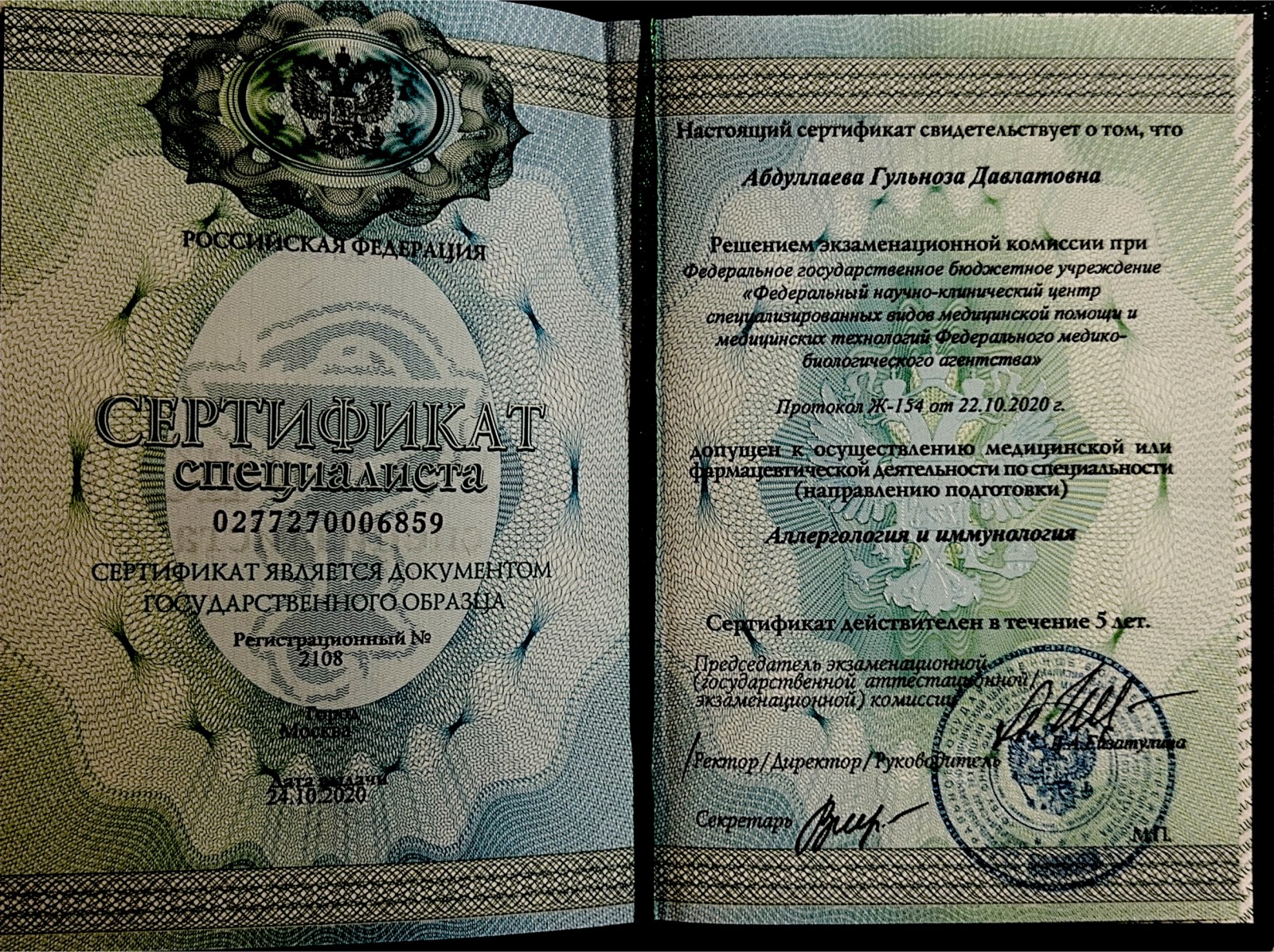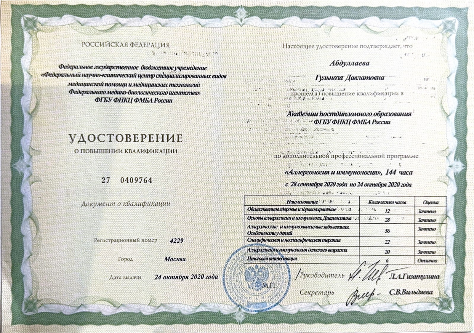- Сертификат о прохождении курса моллекулярной аллергологии Москва 2018, ФГБУ ГНЦ Институт иммунологии ФМБА РФ