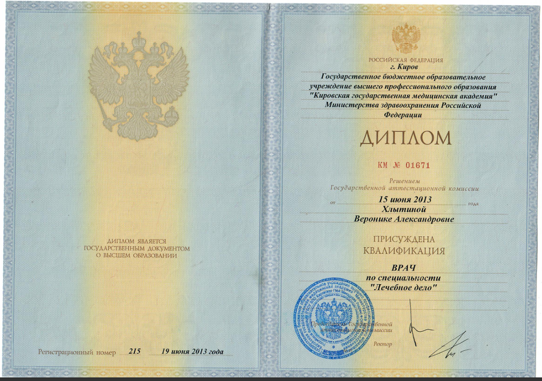 - 2013 г. – Кировская государственная медицинская академия. г. Киров. Врач общей практики