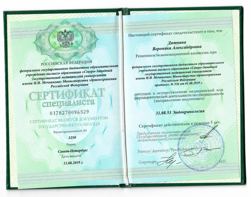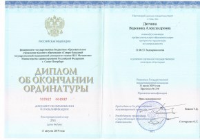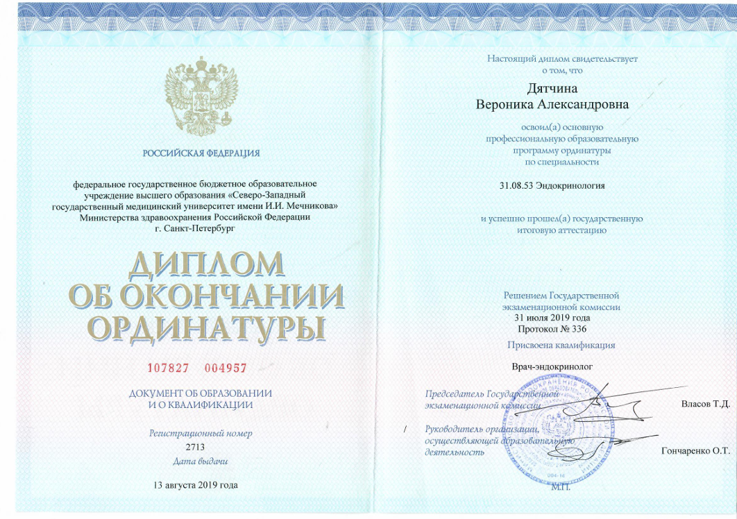 - 2019 г. - Северо-Западный государственный медицинский университет имени И. И. Мечникова г.Санкт-Петербург Ординатура по специальности «эндокринология»