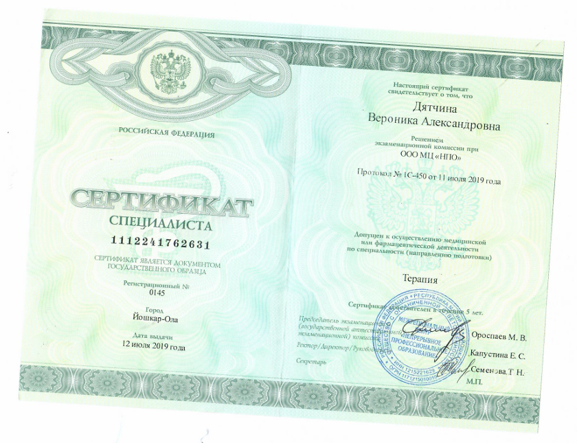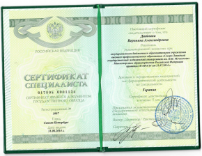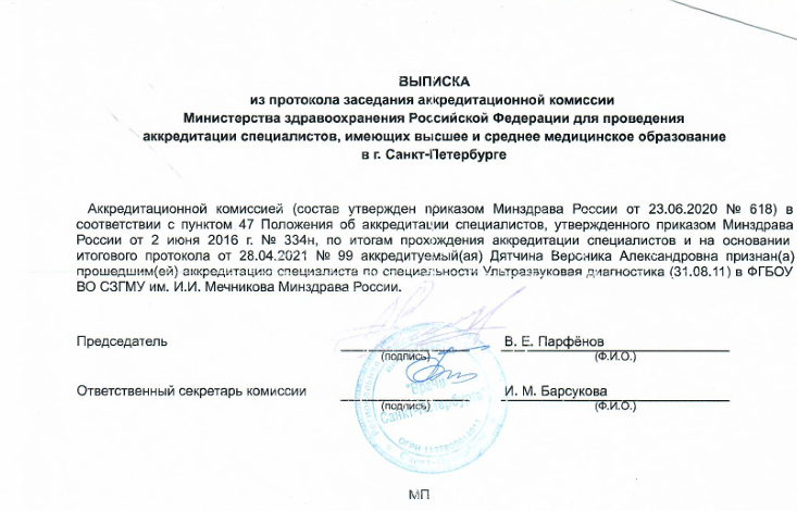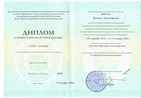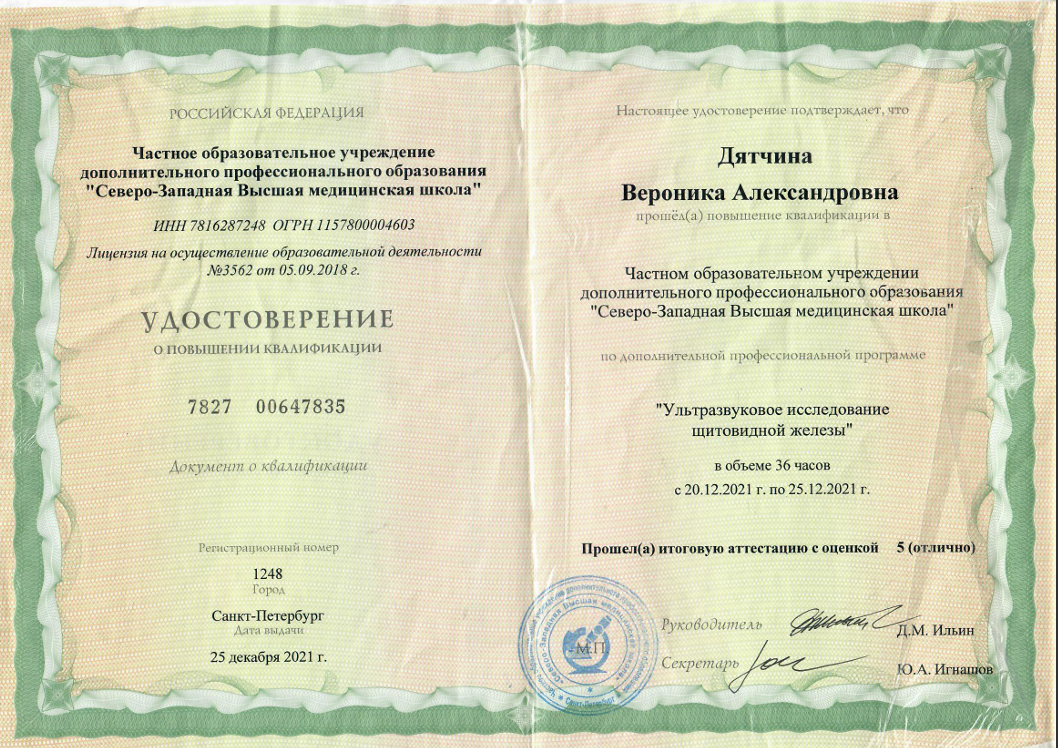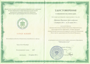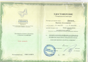 - 2021г. – Профессиональная переподготовка «Ультразвуковая диагностика Северо-Западный государственный медицинский университет имени И. И. Мечникова г.Санкт-Петербург