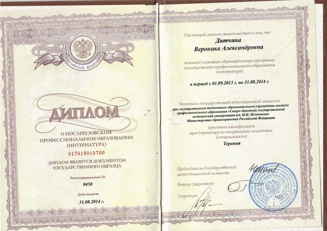 - 2014 г. –Северо-Западный государственный медицинский университет имени И. И. Мечникова Интернатура по специальности «терапия» на кафедре терапии и ревматологии им. Э.Э.Эйхвальда г.Санкт-Петербург