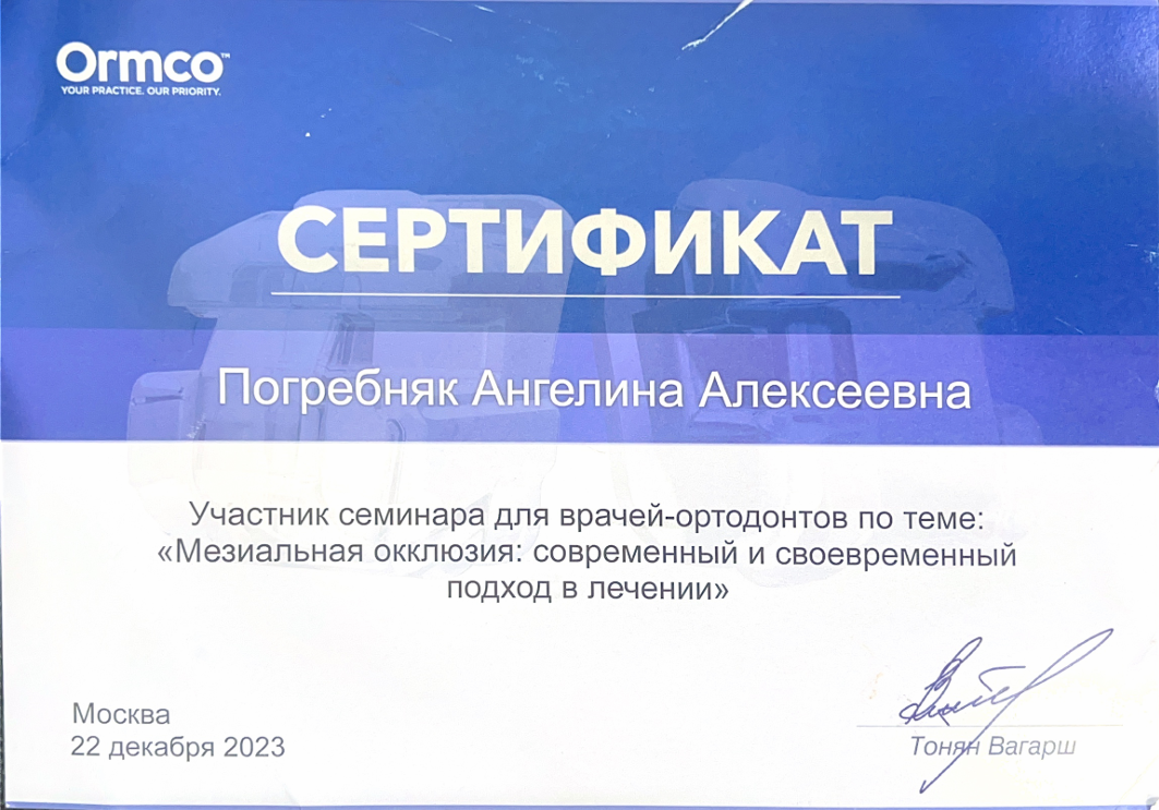 - с 2023 г.- Ординатура в «Научно-исследовательский институт имени Семашко» на кафедре «Детской стоматологии и ортодонтии».
