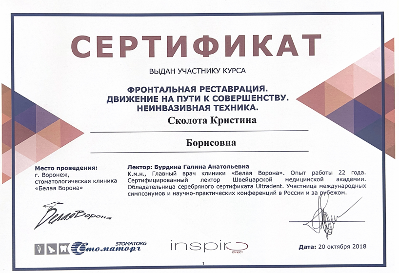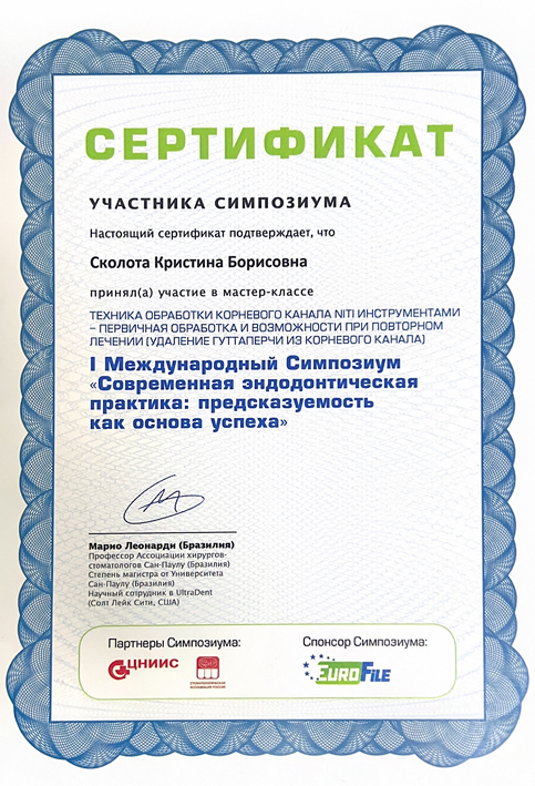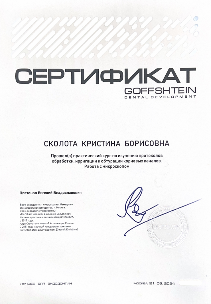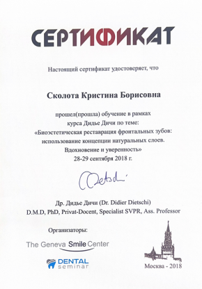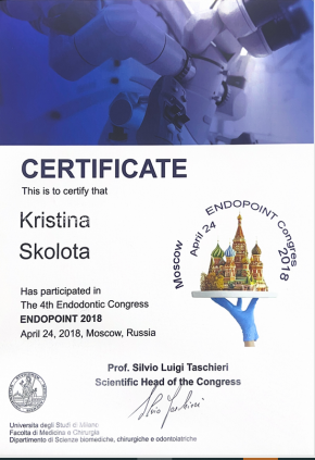 - 2003,2011,2016,2020 г. -сертификат специалиста, стоматология терапевтическая. Москва